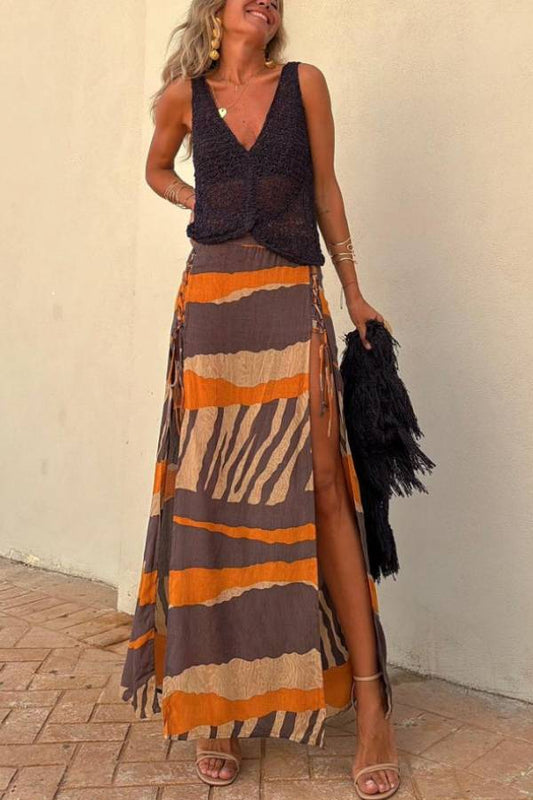 Lynor™ | Block Color Print & Side Laces Long Skirt